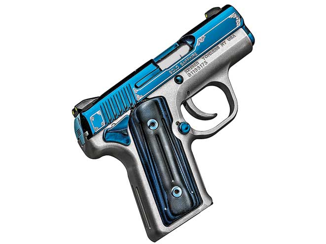This is a DA, striker-fired 9mm pistol with a 7-pound trigger pull. The micro-compact pistol’s slide is treated with a sapphire-colored finish that also appears on the gun’s controls and grip. The MSRP is $1,291. (http://www.kimberamerica.com; 888-243-4522)