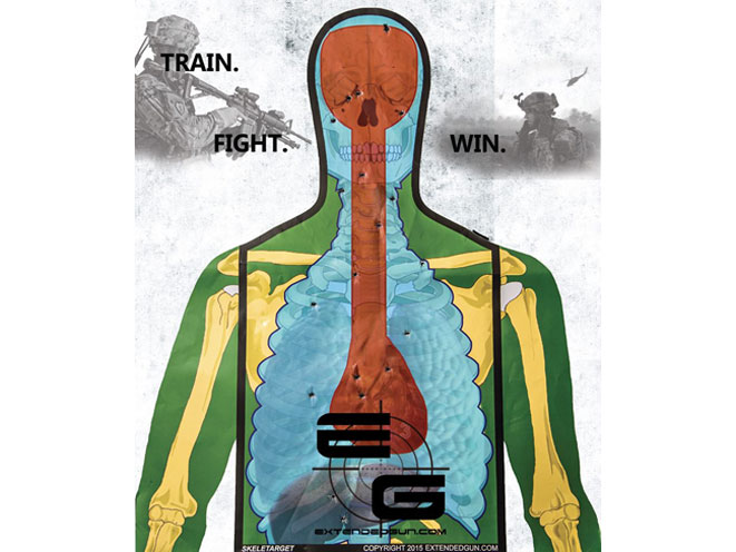 Skeletargets are designed for both competition shooting and anatomical correctness. Designed by veterans of the special operations community, they teach shooters to aim for vital areas. These are realistic targets that demand effective marksmanship and provide the shooter the ability to easily score their hits. Being able to quickly and easily see what your rounds will impact beneath the skin allows shooters to judge the effectiveness of their round placement. Through the use of clearly outlined and colored zones, shooters can easily score their Skeletargets for drills while maintaining a realistic threat target. (http://www.extendedgun.com)