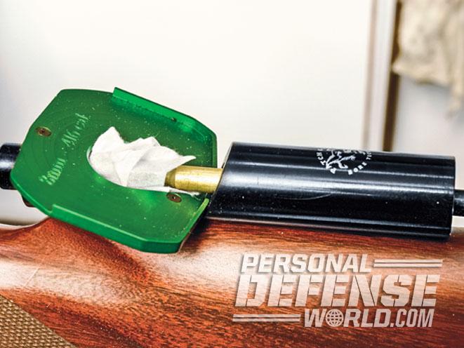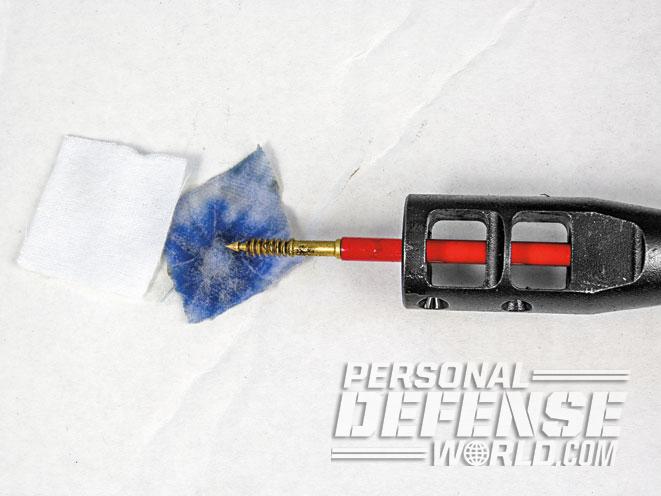 Let the gun sit for a few minutes to allow the solvent to work, and then follow with a couple more wet patches. Wait a few more minutes and run a dry patch through. If there is green or blue staining on the patch, it indicates copper fouling in the bore and that more work is needed. If there is a lot of fouling I’ll switch to a more aggressive copper solvent like Barnes CR10, but only after removing all traces of the first solvent, as they do not always mix well. Most aggressive copper solvents recommend that they not be left in the bore for more than 15 minutes. I wet a patch, run it through and let the bore soak for a few minutes. Then I follow with another patch wet with copper solvent, wait and repeat. The goal is to have no blue or green stains on your patches, indicating that there is no remaining metal fouling.