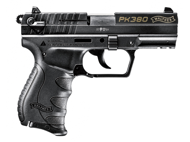 In 2001, Walther took the P99 design principle and applied it to a .22 LR semi-automatic, the P22, now one of the most popular .22-caliber autoloaders in the world. The PK380 is a slightly scaled-up version of the .22-caliber model with virtually the same feel, balance and operating features. Longer at 6.5 inches, taller at 5.2 inches and with a 1.2-inch width, the PK380 offers a slightly deeper grip and more pronounced finger grooves. The larger grip design allows the gun to comfortably fit most hands. The PK380’s general layout duplicates the P22. This includes an ambidextrous manual safety (and decocker), an ambidextrous magazine release (at the rear of triggerguard), a knurled hammer, DA/SA operation, a steel slide over a polymer frame, an integral Picatinny accessory rail, and standard white-dot sights. The PK380 also has a loaded-chamber indicator slot above the extractor, which reveals the rear edge of a chambered round as an added visual check.