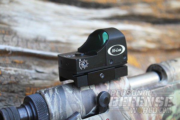 There’s no need to focus, and eye relief is unlimited on the Hi-Lux Tac-Dot. The 4-MOA red-dot aim point is fully adjustable and there is no need to center the dot in the sight window since the sight is parallax-free. The Tac-Dot, once zeroed, will hit where the dot is on the target. It weighs just a hair over 2 ounces and is 2.5 inches long. A light sensor controls the brightness of the dot automatically based on the light conditions.