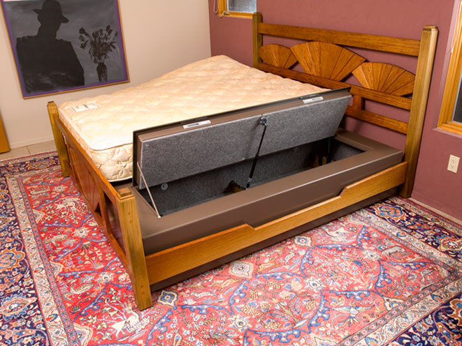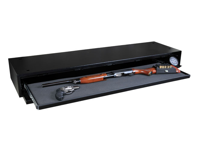 American Security Products makes a back-lit electronic combination safe with a front opening door that fits neatly under most beds. The AMSEC Defense Vault is large enough to fit several long guns on its slide-out, foam-lined tray and allows for quick access. The safe can also be anchored to the floor for additional security.