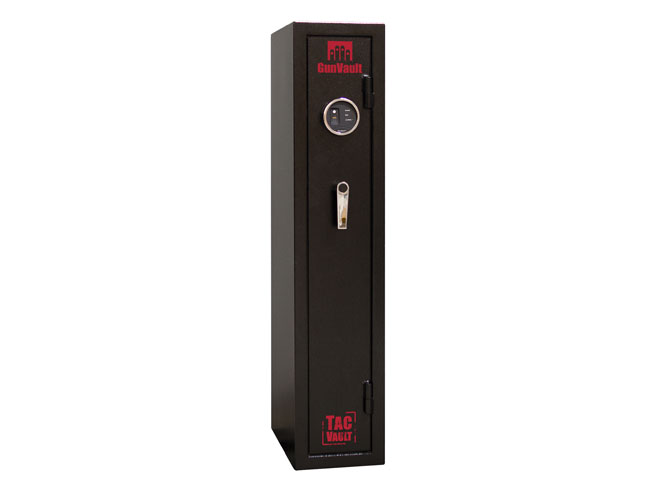 Another reliable option is the TacVault from GunVault, which allows owners of ARs or other long guns to safely and securely store two fully loaded rifles or shotguns in a compact standing safe that can easily be concealed in a closet or behind a door. The safe includes a shelf for storing extra ammunition or magazines as well as other accessories.