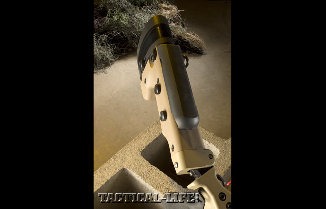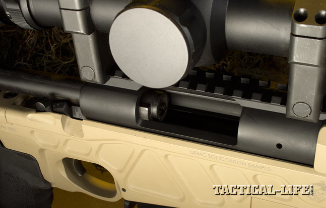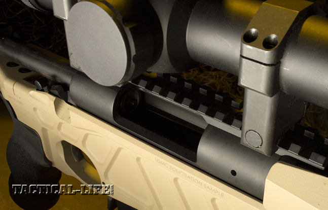 Let’s start with the chassis. Accurate-Mag took what it learned during the development of a prior rifle chassis for a major manufacturer and applied those lessons and its precision machining experience to a new chassis that would meet the requirements set forth by the Marine Corps. This chassis is essentially a three-piece unit. Piece one is the center chassis, which is what the barreled action is bedded to. Piece two is the forend, and piece three is the buttstock. This pieced approach transcends one-piece stock versatility and takes the precision bolt-action rifle into the versatile world of the AR.