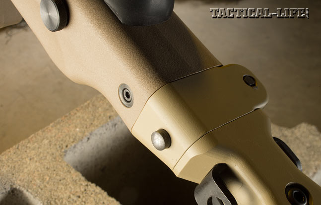 The buttstock section of the three-piece chassis system is attached to the center chassis via two screws positioned just behind the action’s tang. The front of the buttstock—the part that attaches to the center chassis—is aluminum, but the rear section is polymer. The front aluminum section is jointed and hinged. There’s a push button on the right side of this piece that releases the lock, and the stock can be folded 180 degrees. When the stock is folded, the complete rifle can be carried in a case no longer than 1 meter. The center and butt section of the stock together weigh 3.88 pounds, which brings the total stock weight (with bipod) to 5.81 pounds.