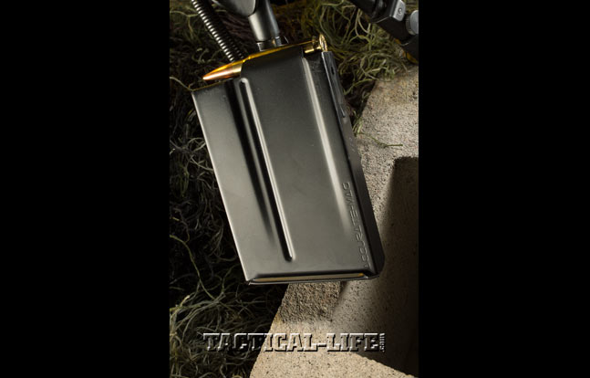 The forend has been skeletonized with horizontal flutes and key cuts for the attachment of accessories or rail sections that are held in place via Chicago-type, hex-head screws. Integral to the top of the forend, or handguard as it should probably be called, is an 11.5-inch section of Picatinny rail that has 28 slots. This rail, which aligns perfectly with the railed scope base on the receiver, will allow for the attachment of a night-vision device. The barrel is free-floated from the action to the muzzle, and the rifle comes with a 9-inch Harris bipod already attached to the handguard. With the bipod and two 3-inch sections of Picatinny rail attached, the handguard weighed 1.94 pounds.