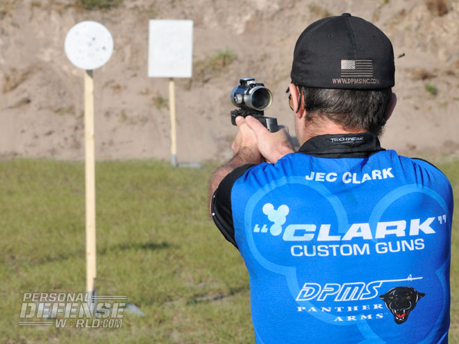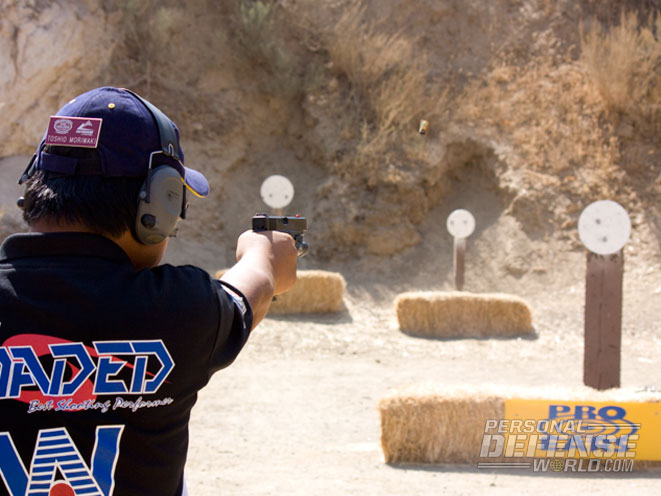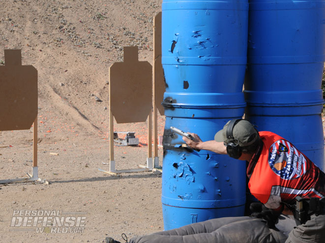 Here an IDPA competitor, while timed, tackles distant targets from behind the wheel of a car—a common situation for many people who have to defend themselves in the real world.