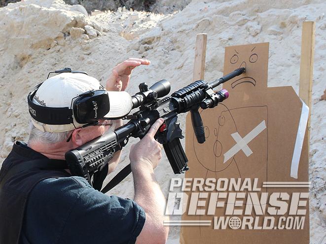 After the briefing, John and his instructors worked with the participants to be sure that their skills would be equal to those needed for the live-fire scenarios that would be presented on Day Two. Individual attention is given to each participant. After lunch, the afternoon was occupied with a series of move- and-shoot and cover drills. Participants practiced moving, shooting and reloading while engaging hostile targets that were partially obscured by no-shoot targets. John emphasized several important defensive techniques here, including keeping your eyes on the threat and scanning for additional targets, transitioning from pistol to rifle while on the move, reloading on the move and never appearing from cover in the same location.
