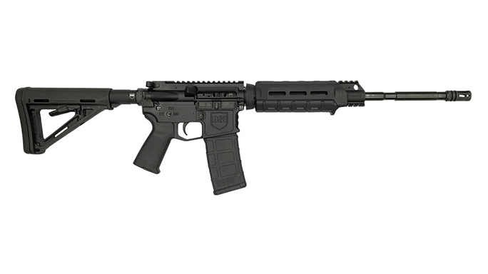 Dark Storm Industries DS-15 MOE Standard: This rifle uses a carbine-length gas system with an M16 bolt carrier group. Matched with Magpul gear, this gun gives you a lot of desirable upgrades in its standard package. This is an optics-ready rifle, and the gas block is railed for the installation of a folding front sight.