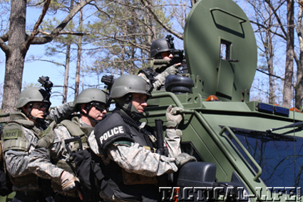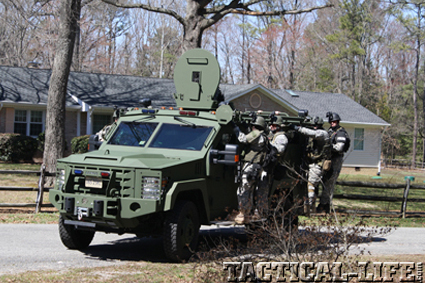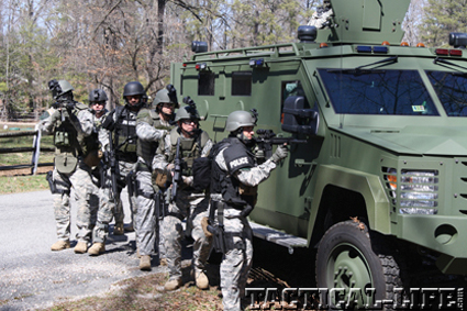 One of the newest, and certainly the largest, pieces of equipment is a Lenco BearCat armored personnel carrier. Secured with the help of a Department of Homeland Security grant, this 17,000-pound vehicle can withstand calibers up to .50 BMG and comes with an integrated FLIR thermal imager. It will accommodate 10 fully geared officers inside and can transport the remainder of the team on dual external running boards. The BearCat also features a turret with an armored shield and view/firing port, multiple side and rear firing ports and a front-mountable ram for defeating barricaded or reinforced doors.