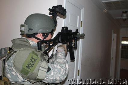 SWAT officers keep all of their gear in their patrol vehicles for rapid responses. This consists of 40 to 50 pounds of body armor, a helmet with a night-vision monocular, shields, weapons, ammunition, communication gear and gas masks. The department’s standard patrol rifle is an ArmaLite AR-15 carbine with a mid-length gas system and topped of with an EOTech holographic sight. Some of the rifles are suppressed SBRs, and according to SWAT Commander Lt. Tim Spivey, the goal is to eventually suppress every one of the department’s rifles in order to help protect the officers’ hearing.