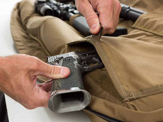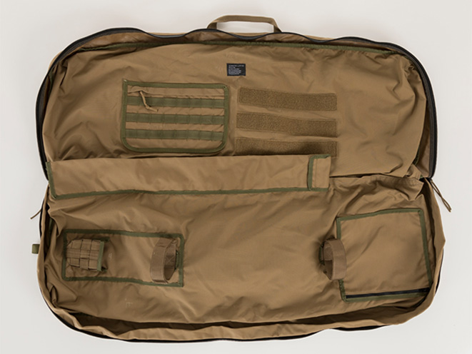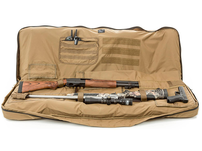 The exterior is made of a lightweight 1,000 Denier, urethane-coated material that lets you roll up the gun case into a tight and compact roll that can be easily stowed. Other features include YKK water-resistant zippers, accessory pouches, MOLLE attachment straps, backpack straps for hands-free transportation, and more.