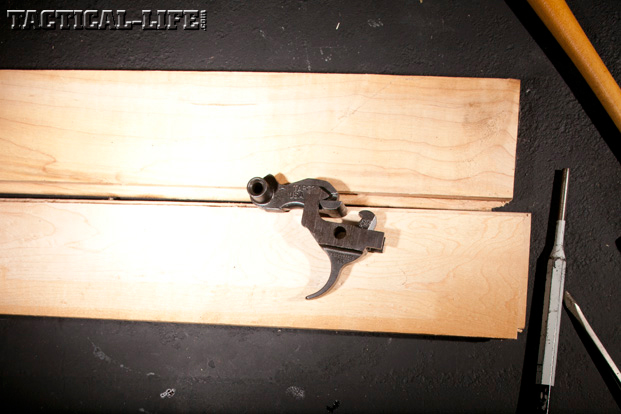 CHECK THE SET: If you tackle this job, be sure to test it thoroughly before firing. I found that a forward surface on the trigger was touching the trigger hole in the bottom of the receiver and keeping the hammer from resetting properly. I took a needle file and smoothed the inside front surface of the trigger hole in the receiver, fixing the problem. When I finally test-fired the rifle, I only loaded one round into the magazine.