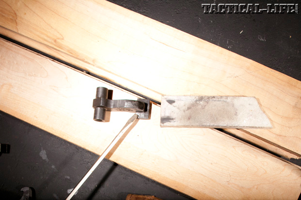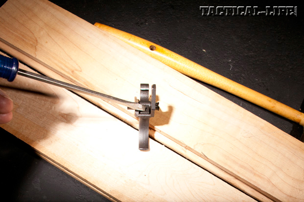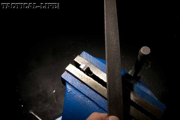 FILE WORK: The next task is to file down the disconnector reset mechanism, thereby allowing the forward portion of the disconnector to come into contact with the back of the hammer as the trigger is pulled. After a couple of file-and-try efforts, I had enough material removed to let the disconnector contact the back surface of the hammer. After final reassembly, the trigger pull weight rose to 3 pounds, 11 ounces, and it provided a wall when the trigger was depressed.