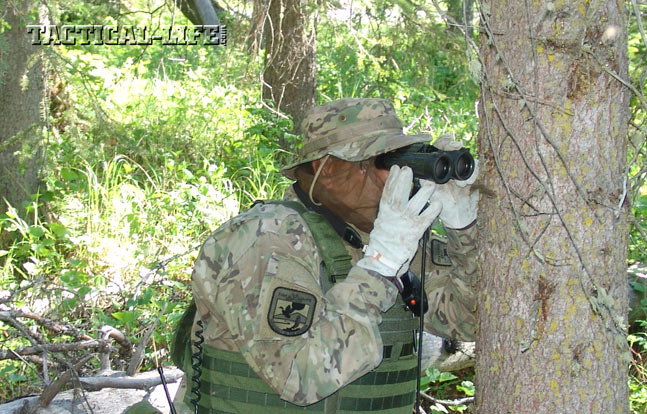 Everything around him pulled, pricked or bit at him, as thorny stalks clung to his legs and mosquitoes and flies swarmed by the thousands. Nearby, another trooper encountered a moose and her calf—he then gave them a wide berth, as he knew a protective adult cow was a very dangerous threat. After a long approach, the sniper finally saw the peak of the house and began the stalk, finding a ravine that fed down to the opening where the house was located. He crawled slowly until a large stump blocked his way but also provided excellent cover. At that point he set up and began making observations and taking pictures that he, as well as several other snipers located around the structure, quickly transmitted back to the command post that put together an accurate understanding of the situation, terrain and structure. With the intel flowing in from troopers now all around the target, the command post close to the outer perimeter was able to map the number and locations of the people inside the house as well as the physical layout of the doors, windows and stories.