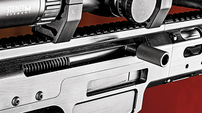 First off, everything about the Ulfberht is built to last. The rifle starts with a forged 9310 steel receiver and an aluminum top cover. The 27.5-inch, 4150 chrome-moly barrel features six-groove, 1-in-9.3-inch-twist, Enfield- pattern rifling. The muzzle sports 18×1.5 threading—a common European .338 Lapua thread pattern—and comes equipped with a three-prong flash suppressor made of 4140 steel.