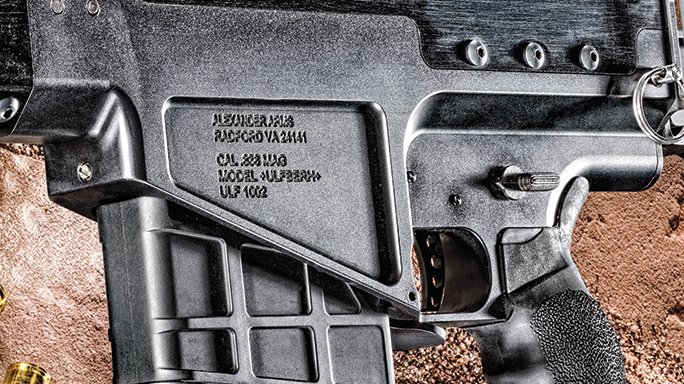 The pistol grip is a Hogue Deluxe model, while the safety is similar to an AR’s. As for the trigger, a Geissele Automatics two-stage, 4.5-pound SSA unit is installed. A paddle-style magazine release is located just in front of the triggerguard. The Ulfberht uses Alexander Arms’ own reinforced-polymer, double-stack, 10-round magazines. My test Ulfberht came in a hard case with custom-fitted foam inserts and four magazines.