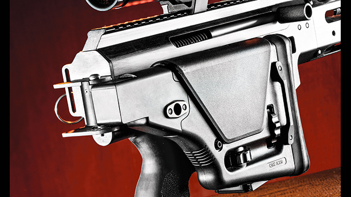 The Ulfberht comes with a folding Magpul PRS stock for easier carry and transport. Mounted solidly to the receiver with a steel hinge, the stock locks into place when it’s folded and extended. You can release the stock with one hand using the top-mounted release button. Also, the PRS design features thumbwheels that allow you to adjust the length of pull and cheek height with just your fingers.