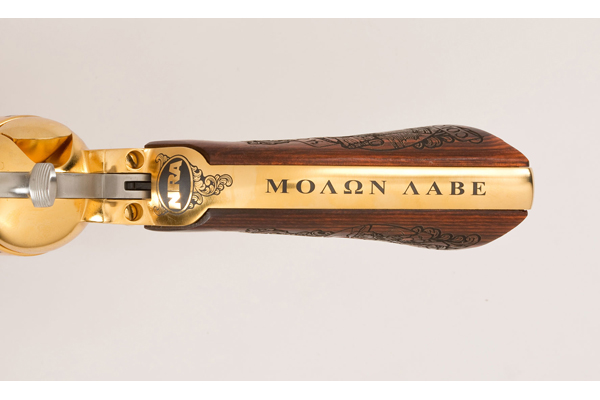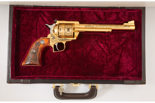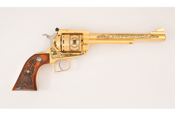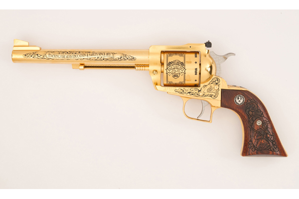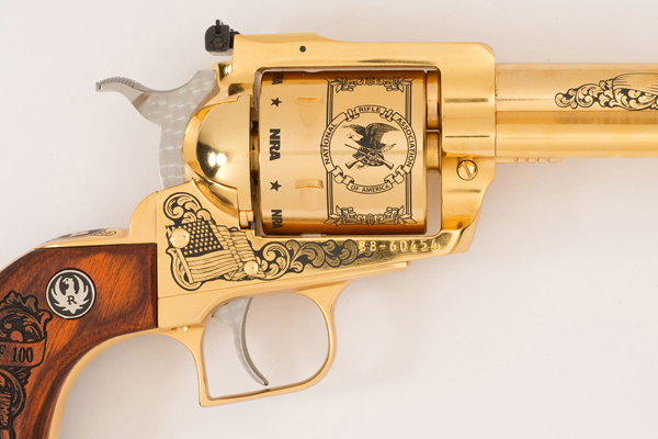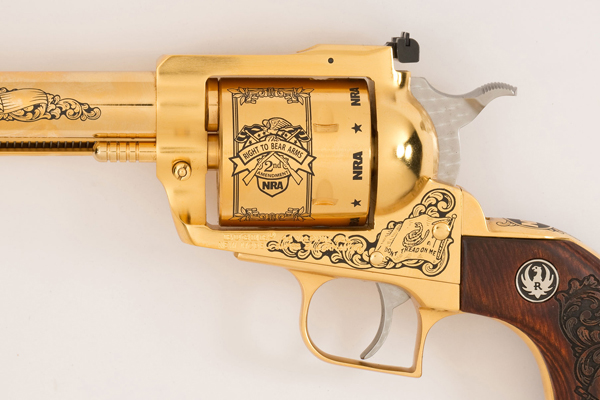 Built on a fully-functional Ruger Super Blackhawk .44 Magnum, this special edition revolver comes with a 24kt. gold-plated cylinder, sights, ejector rod housing, barrel, muzzle, trigger guard, top strap and back strap. It also has a number of special engravings, such as “The Second Amendment Protects the Rest” on the right side of the barrel, “Teaching Firearms Education & Safety Since 1871” on the left side of the barrel, NRA logos on either side of the cylinder, “Molon Labe” (meaning “come and take it” in Greek) on the back strap, and “Don’t Tread on Me” on the frame above the trigger.