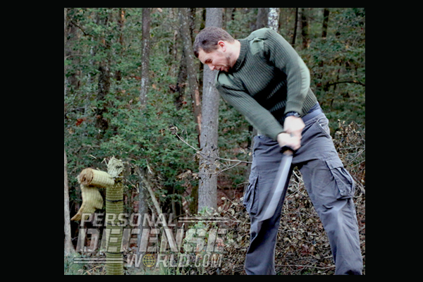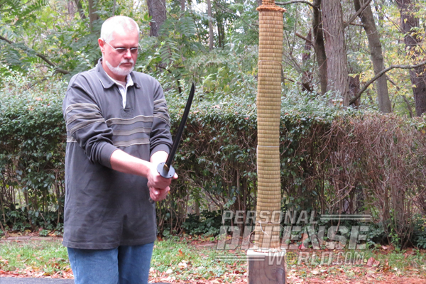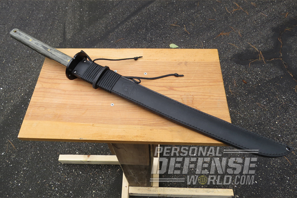 The Garuda’s full-tang design and Micarta scales make for a rugged piece that held up to a lot of abuse in my testing. The factory edge was decent, although not razor sharp, but it worked fine for the rough field use I put it through. I used it to pry open a wooden ammunition crate and hack up a few ranging stakes one day on the rifle range, and I even used it to dig out a fire pit and hack up some roots that were in the way. It’s a lot tougher than some of the knives I actually did use in the service and I think it’ll work well for troops wanting a tanto-style blade for hard use. Performance was quite good, but I have to admit to spending most of my test time with the Tactana. There’s something about a sword that calls to folks, and I’m not immune to its siren song. I’d like to address an issue of practical utility with the modern sword before I go into my field tests. Though I’ve heard rumors of modern swords actually seeing service overseas with individuals in military units, I honestly haven’t seen anything to verify this. I won’t say there isn’t someone toting them around, but so far no photos have surfaced that I’ve seen, and I haven’t heard any first-hand accounts of their use. Couple that with the fact that even a compact sword like the Tactana adds a fair bit of weight and bulk to a trooper’s battle rattle and I have to say I’m a little bit skeptical. If you have evidence to the contrary, please drop us a line here at Tactical Knives, it’d make a great story!