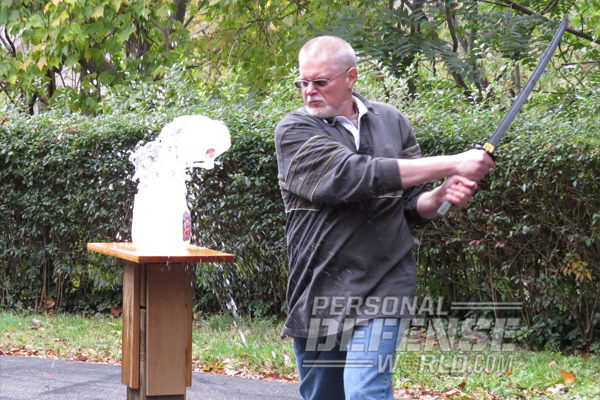 There’s a big difference between actually cutting with a blade versus simply doing forms. One thing that became readily apparent to us throughout the day was that the Micarta handles on the Tactana work well. The bead-blasted finish of the Micarta proved very comfortable to use, even with full-power strikes. It also gave an excellent grip even when the handle was wet from the water-jug cutting and a little slimy from handling the severed pumpkins. It was certainly a lot easier to clean than a traditional cord wrap when we finished, too. If you’re in the market for a modern sword suitable for whatever defensive role you foresee, or simply a blade that will hold up to actual heavy cutting training then the Tactana will certainly fill that niche. The Garuda makes a good modern match up to it as well and will hold its own as a rugged field blade even if you don’t need a sword to go with it.