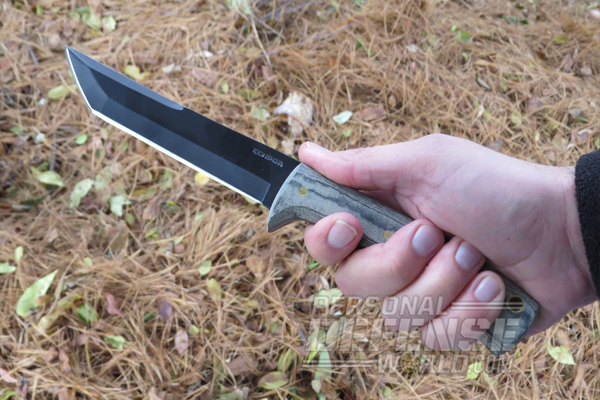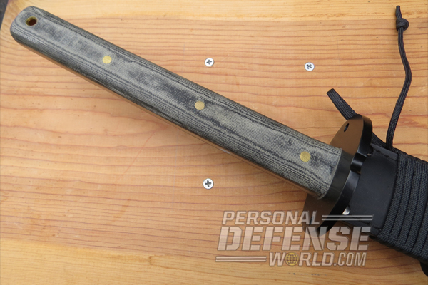 While the Garuda Tanto is a good, solid tactical blade, the Tactana really steals the show when you have them both side by side. Joe told me that the Tactana was derived from the need for a combat-ready, Micarta-handled sword for the American market. It’s hardened to a Rockwell of 53 for toughness and is designed to take punishment. The handle was engineered to match the specifications of martial artists, and Condor studied dozens of design samples and even contacted Japanese sword collectors to find specifications on ancient pieces when designing the piece. Joe said that it was decided that this length was ideal for a do-it-all sword, though if it’s popular a longer version may be in the works later. Featuring a full tang and a slightly curved, 21-inch-long blade with a heavy steel tsuba above a 9.5-inch long handle, the Tactana comes in just shy of 31 inches overall. This puts it more in the size of a wakazashi than a katana, but that’s probably better suited to a modern close-quarters combat role anyway. I’ve seen the weight listed as 2.95 pounds, but mine came in at 2.6 pounds with the scabbard and 2.1 without it on my scale.