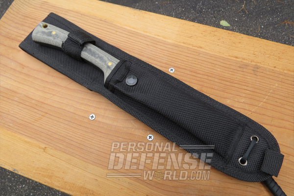 Speaking of the scabbard, Condor deviates from a traditional-style scabbard and instead uses a heavy leather scabbard with a paracord wrapping. Joe explained that it is designed to be flat and quiet so it can be stowed away or strapped onto a bag easier. It’s well made and very functional, although a little slower on the draw than a traditional-style scabbard. Price on the Tactana is a very reasonable $209.98.