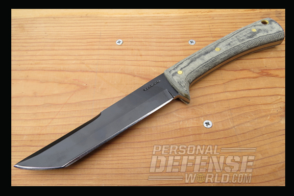 Condor’s Tactana is one of those pieces, and when you match it up with their Garuda Tanto you have a pair of blades suitable for the modern-day street samurai. Joe Flowers, who is responsible for much of the design work at Condor these days, designed both the knife and the sword. Both blades are made from 5mm-thick 1075 high-carbon steel with a matte black powder coating. Handles are black Micarta affixed with brass pins and epoxy, and feature brass-lined lanyard holes at the butt. The Garuda is a full-tang design that uses a 6-inch blade with an American-style tanto point and features a saber grind with a 3-inch, unsharpened swedge. The generous 5.5-inch-long handle brings the overall length to 11.5 inches. The scale-to-frame fit is seamless, and the Micarta is left with a slightly textured finish for a positive grip. The Garuda comes with a sturdy nylon sheath fitted with a hard plastic liner. It has a large belt loop as well as a series of MOLLE-compatible loops on the back and a utility pocket on the front. Retention is by means of an adjustable Velcro strap that wraps around the handle. Weight of both knife and sheath comes to 16.5 ounces. MSRP on the Garuda is $94.98.