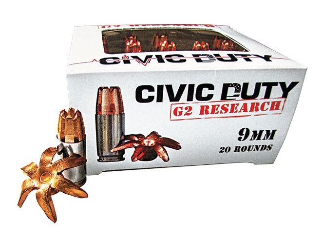 G2 Research works exclusively with lead-free projectiles made of solid, milled copper to create expanding projectiles with pretty extreme characteristics. The company’s Civic Duty round is the latest development along the lines of its R.I.P. fracturing round, and is engineered for the petals to open up into individual arms (more like a star than a mushroom) that remain attached to the slug’s body for full weight retention. Designed to penetrate 9 to 10 inches in bare ballistic gelatin and not over-penetrate walls or attackers in close quarters, the expanded 9mm Civic Duty rounds can reach a diameter of approximately 0.9 inches. (http://www.g2rammo.com)