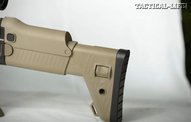 And what about the rifle surrounding that awesome barrel? The rifle looks like a visibly lightened SCAR with M4-like ambidextrous controls and a nice folding stock that is adjustable for cheek height and length of pull. The ergonomics are very similar to the M4, so most shooters will feel at home shooting this little rifle.