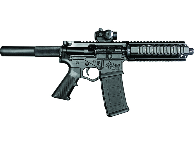 American Tactical’s Omni Hybrid pistol uses a polymer lower with a patent-pending steel reinforcing plate molded into the receiver at the rear takedown pinhole. The pistol uses an aluminum upper receiver, and a quad-rail, free-floating handguard covers the 7.5-inch barrel. The pistol is offered without sights, with flip-up iron sights or with a red dot, and this accounts for the price differential. The Omni Hybrid is a lightweight, economical option for those looking for an AR pistol.