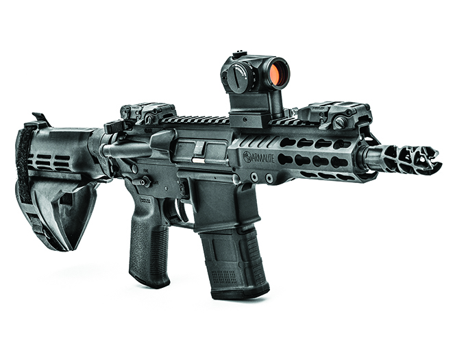 The Armalite M-15 6” has one of the shortest barrels currently on any AR-platform pistol, a mere 6 inches, for an overall length of just 24 inches. At the rear of the pistol is a Law Tactical Gen 3 Folding Stock Adapter that allows the Sig Sauer SB15 Stabilizing Brace to be folded, bringing the M-15 6” down to only 17 inches. The pistol’s double-lapped, chrome-lined, 1-in-7-inch-twist barrel is fitted with a compensator. The forged aluminum flattop upper receiver has a 12-inch Picatinny top rail, an AXTS Raptor ambidextrous charging handle and a KeyMod handguard. The lower features a Magpul MOE-K2 pistol grip, an ambidextrous safety and a two-stage precision trigger.
