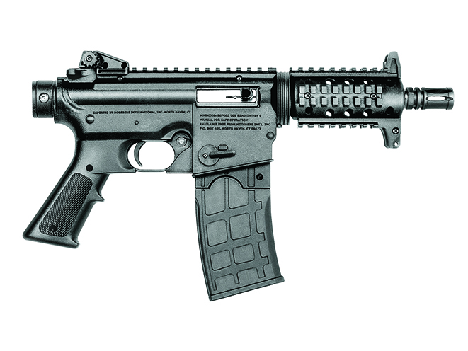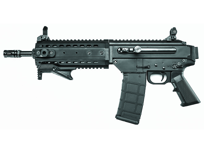 This megapistol looks like a cross between an AR and an AK pistol, but it is neither—although it’s chambered in 5.56mm. It uses AR magazines and an AR pistol grip, but the operating system is different (it’s a short-stroke piston), and it has other features that some believe are superior.