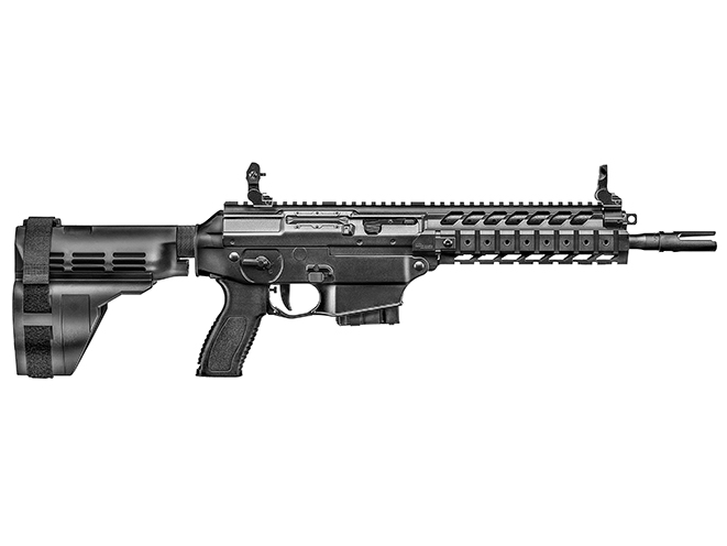 The P516 is available with either a 7.5- or 10-inch barrel. This model uses a reliable gas piston operating system fitted with a four-position gas regulator that can be tuned for conditions, fouling, ammunition, etc. Chambered in 5.56mm NATO, the military-grade barrel features a standard A2-style flash suppressor and is surrounded by a railed, free-floating handguard. Sig Sauer also outfits this pistol with flip-up sights and an SB15 brace.
