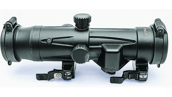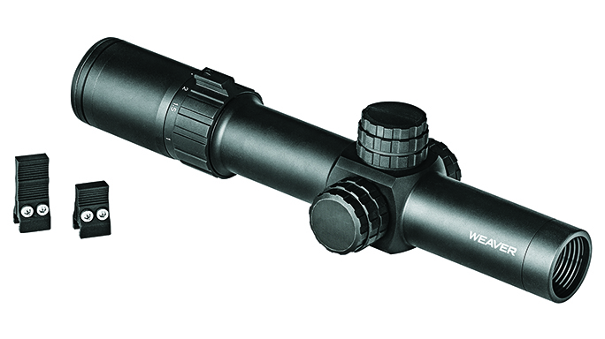 This 34mm-tubed scope has a 4-MOA, second-focal-plane red dot for use when the scope is turned to 1X for CQB distances, but it also has an etched-glass, mil-dot reticle in the first focal plane that changes size along with the image as magnification increases or decreases. The red dot can be turned off when using the mil-dot reticle. (weaveroptics.com; 866-788-7386)