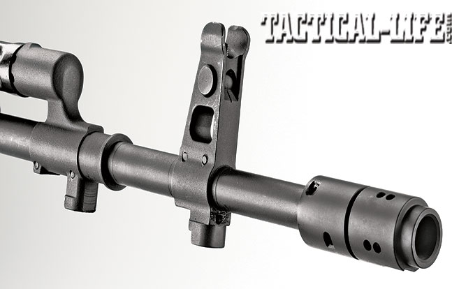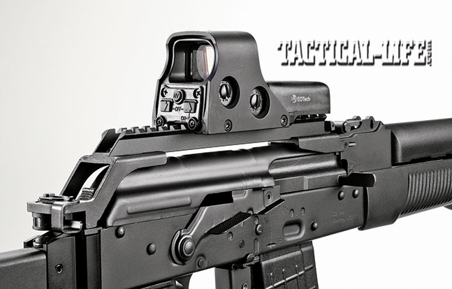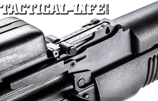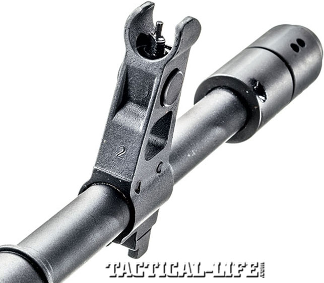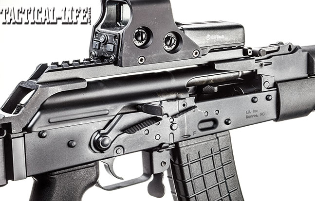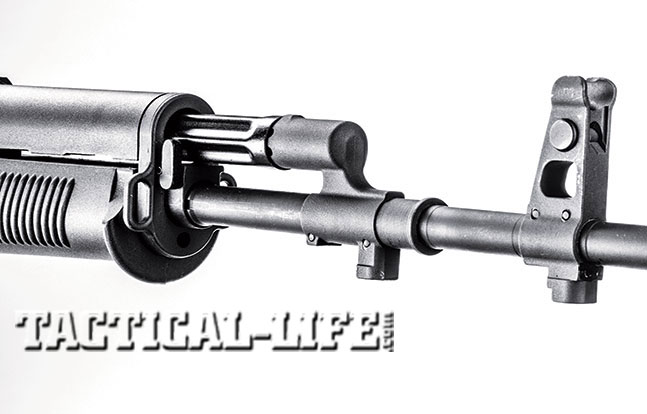 The ergonomics of the rifle are quite good. The magazine-release paddle features an oversized tab for easier manipulation, and the safety lever is also equally enhanced. To allow for easier manipulation, it features a large tab in the middle of the lever. Interestingly, it also features a cutout for capturing the bolt carrier’s charging handle so the action can be locked open. The optic mount is also quite impressive. Featuring two solid mounting points—interfacing with the rear sight block and the rear stock trunnion of the receiver—the mount is made of steel and features a sighting channel for the use of the iron sights in tandem with an optic.