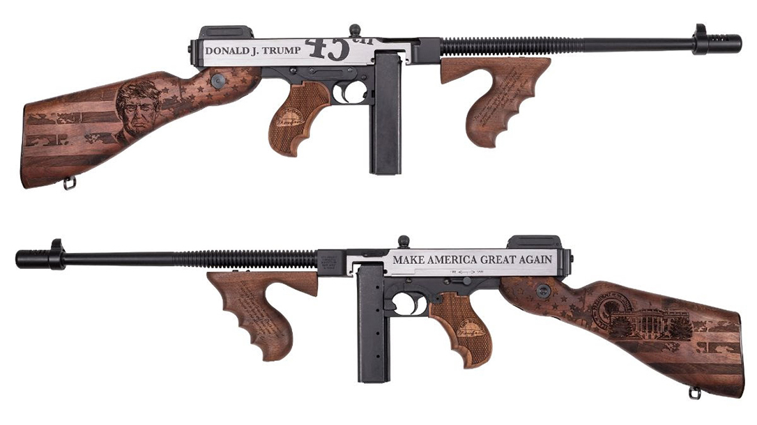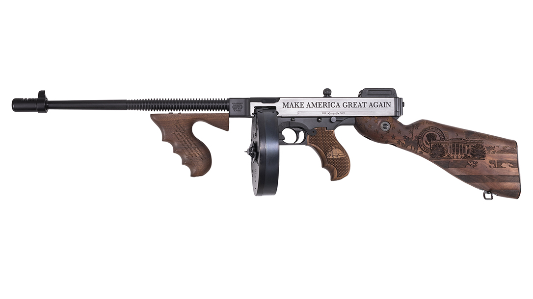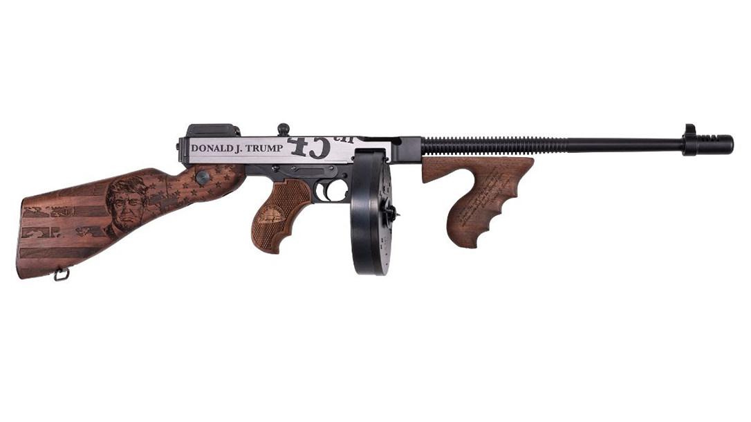 The Trump Thompson has a 16.5-inch finned barrel and an overall length of 39 inches. It weighs 12.5 pounds. It also comes with a 50-round drum magazine and a 20-round stick magazine. MSRP on the Trump Thompson (model T1-14-50DC1) is $2,309.