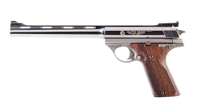 In 2015, a new South Carolina-based company called Auto Mag Ltd. Corp. purchased the rights to the AutoMag from the original owners and set about re-introducing this iconic gun to the marketplace. It looks like that day is fast approaching. The company has announced that it has shipped out 77 new .44 AMP AutoMag “Founders Edition” pistols with 8.5-inch barrels. While those units are spoken for, pre-orders are now being accepted for the “Classic Edition” AutoMag with either a 6.5-inch or 8.5 inch barrel, and Hogue G10 or checkered wood grips.