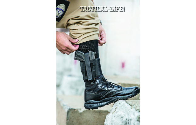 holster. Made of leather, the gun/holster combo was carried vertically (muzzle down) under my weak-side arm, similar to a shoulder holster. When I began carrying a Glock 19 as a duty sidearm, I replaced the 3913 with a Glock 26. The current concealed armor holster I use is an Aker Model 150 Hideout Holster. With many officers now opting to wear external vest carriers, inside-the-shirt carry may no longer be an option for them. However, if the external armor vest is equipped with MOLLE straps, a nondescript holster pouch on the vest can be substituted. As noted earlier, ankle holsters are a good option. Their unorthodox location can actually be a benefit in some situations, and with the plethora of high-quality, ultra-compact autos and revolvers around today, they can be a viable option.