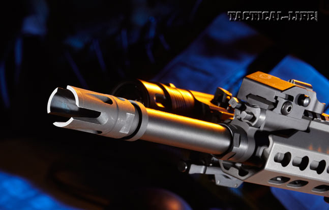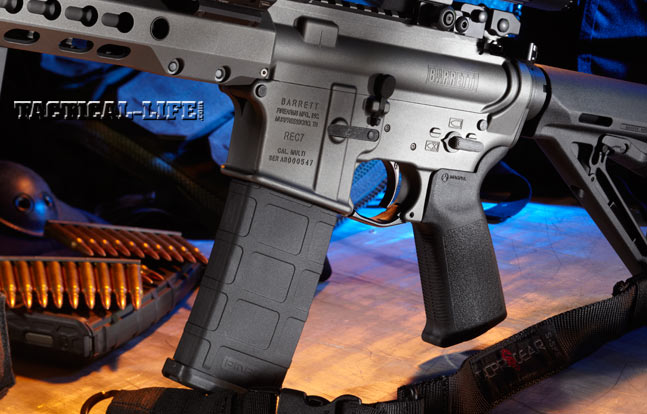 The new handguard covers a Barrett-built, 1-in-7-inch-twist, chrome-lined, hammer- forged, medium-contour barrel that is chambered in 5.56mm NATO with M4 feed ramps for excellent reliability. Capping the barrel is Primary Weapons Systems’ Triad flash suppressor. A large nut threaded to the barrel secures the two-position gas block. With no pins or screws to come loose, the gas block can be removed using standard tools. A nice touch is the fact that the rim of a cartrige can be used to adjust the gas system, with positions for standard firing, suppressor use and removing the system.