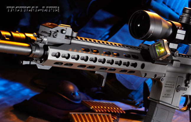 Upon the REC7 Gen II’s arrival, it was immediately evident that Barrett’s rep was not kidding when he called it a first-class rifle. This REC7 is nice—one of the nicest I’ve handled in a long time. The first thing I noticed is its feel and balance. Barrett designed and builds the new Gen II forend, which utilizes the popular KeyMod system and allows you to add rails and accessories as needed. The handguard is octagonal and narrow, providing a comfortable handhold, with a flat bottom where it attaches to the rifle’s upper receiver. A continuous top rail offers plenty of real estate for mounting sights, optics and accessories. The remaining surface is smooth with no sharp edges, making it very comfortable to hold. Reminiscent of a “melt” treatment on a carry pistol, the handguard sort of melts into your hand, yet it’s thicker in construction than most. Again, it has a really solid feel. Key slots at the 3, 6 and 9 o’clock positions let you add all you would need in the way of accessories. Sling-cup slots with protective inserts are located at the rear on both the left and right sides of the forend.