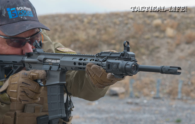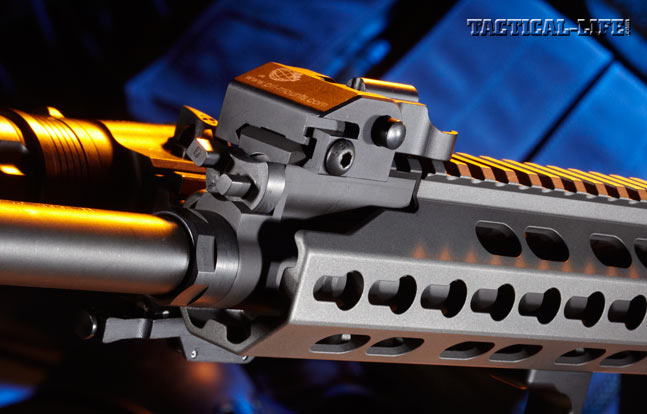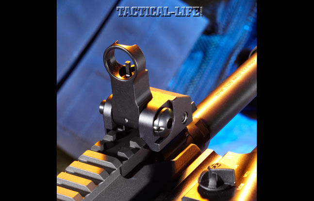 I completed the vast majority of this test using the iron sights and 55-grain Federal XM193 FMJ ammunition. Precision Reflex sights, among the best you can buy, are some of my favorites. The front sight, completely enclosed in a ghost ring, allows for very fast close-quarters applications. Centering the front circle inside the rear aperture puts shots dead center at close range. At longer ranges, it allows for solid holds, especially on nearly round targets, similar to those often encountered in the real world. I also tested the handguard by attaching several lights.