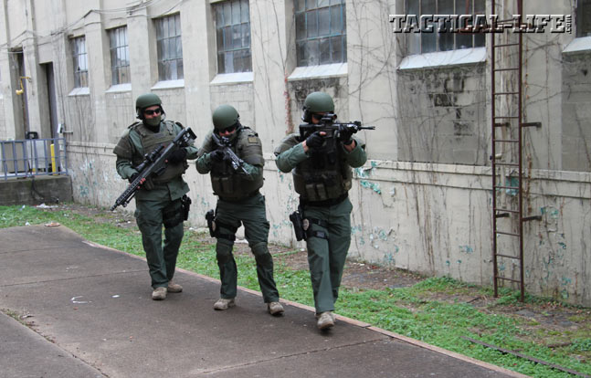 Operators equipped with REC7 Gen II rifles help their designated marksman, carrying a Barrett MRAD, into position. These rifles feature expertly applied Cerakote finishes for the ultimate in durability.