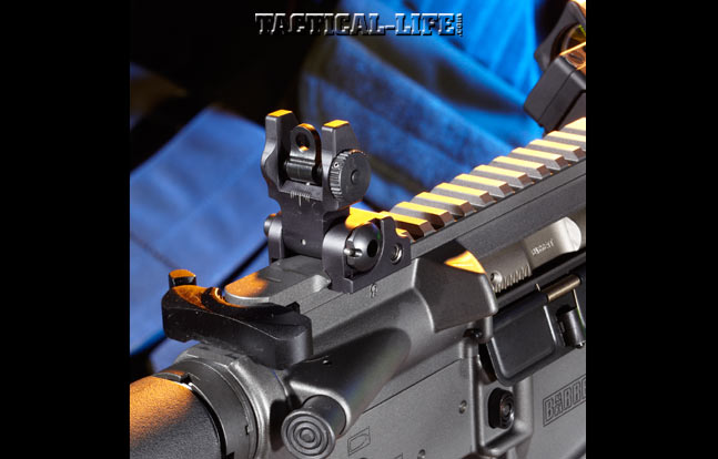 Barrett shipped the grey test carbine with Precision Reflex’s front and rear backup sights, which are quick to get into action. Note the front sight’s full-circle hood.