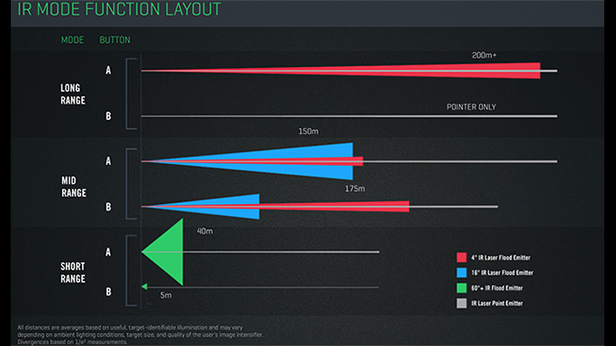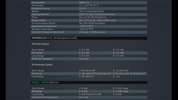 The power balance of infrared illumination and pointing irradiance at different ranges becomes critical as commercial night vision quality continually increases, which is why MAWL-C1+ brings settings specific for close range to long range target engagement. By utilizing a uniquely arrayed laser core, the MAWL-C1+ is able to incorporate a laser illuminator capable of outperforming other civilian legal laser systems on the market, and also outperforms many restricted devices. This provides the user with a distinctive and functional near infrared illuminator with unrivaled irradiance on target, allowing for positive identification of objects, the ability to surpass many photonic barriers, as well as faster target acquisition either on the range or in the field. On top of this, the visible green laser pointer in the MAWL-C1+ has selectable low-power settings for close range boresight precision that is also slaved to the near infrared pointers. Once the user has zeroed the visible green laser, the infrared lasers are also automatically zeroed, getting you into the field faster at night. By featuring centralized, co-aligned emitters, the MAWL ensures that all beams are simultaneously on target, regardless of distance.