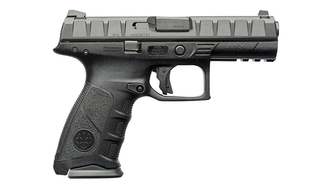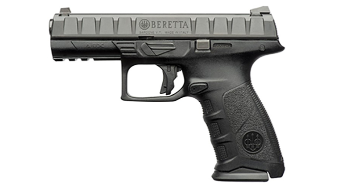 Chambered in 9mm and .40 S&W, the Beretta APX is a striker-fired, full-size duty gun first introduced last year which features a 4.25-inch barrel; high grip position; aggressive, full-length slide serrations; oversized magazine baseplate; ambidextrous, reversible controls; Picatinny rail for accessories; trigger break of six pounds; overall height of 5.6 inches; overall length of 7.55 inches; and an overall weight of 28.24 ounces (9mm) and 28.92 ounces (40 S&W) unloaded.