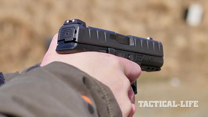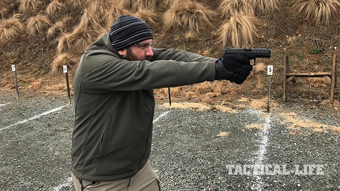 Our first range session was a half day of running the gun in realistic tactical drills that demanded the type of speed and precision that the Beretta APX was designed to deliver. We worked targets from close range and out to 15 yards, and got acquainted with the gun and its flat 6-pound trigger. We had time to reload with the teardrop-shaped magazine release and settle into the modular frame and interchangeable backstraps. I made the switch to a small backstrap insert early in the day, and it significantly improved my ability to work the trigger.