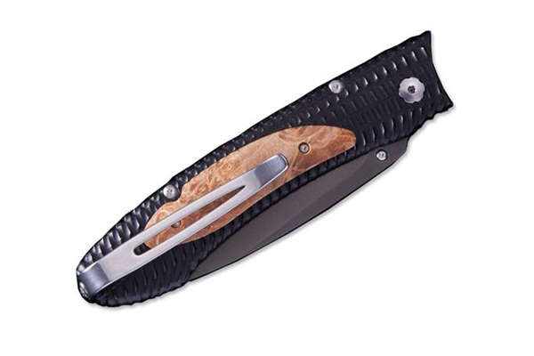 The Henry knife features a sculpted frame in aircraft grade aluminum, inlaid with a dramatic piece of box elder burl wood, and the pocket clip and fittings are crafted from stainless steel and titanium, tempered for optimal wear resistance in any condition.