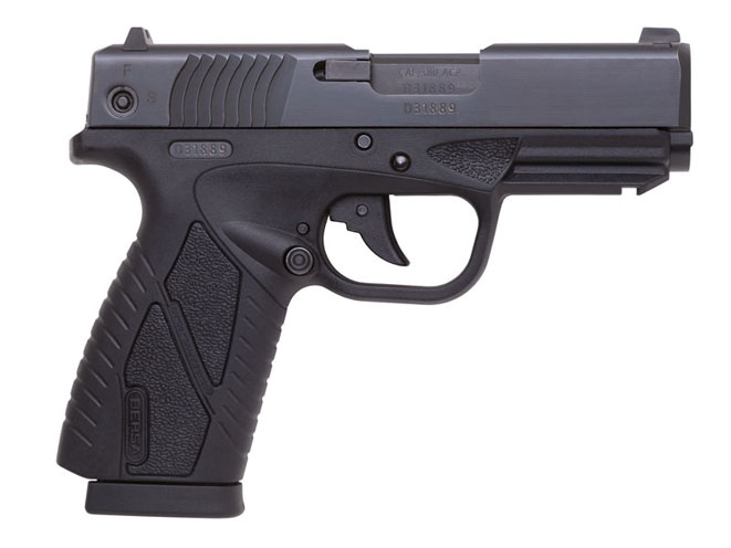 The BP380 CC comes with a textured, full size grip, which allows for a positive four-finger hold and reduced felt recoil. The grip also provides a higher carrying capacity than a majority of subcompacts with an 8+1 capacity. This pistol also boasts a light, crisp and short trigger pull, and interchangeable dot-sights. The barrel length is 3.3″. In addition, the BP380 has a width of .94″, a length of 6.35″, and a height of 4.8″.