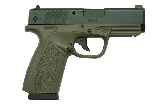The Bersa BP9 concealed carry pistol is available in three finishes: matte black, Duo-tone (matte black frame and stainless slide) and Duo-tone in matte olive (pictured above). It comes at an MSRP of $475.00 – $485.00. See below for additional details.